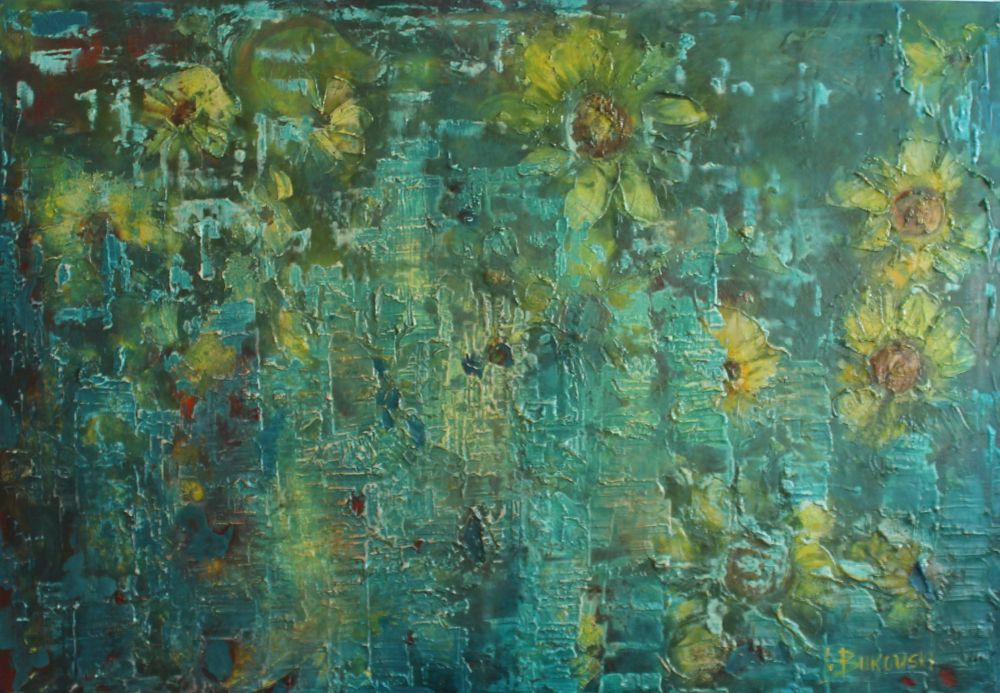 Dominanta wystawy – duże formaty, oryginalna i urozmaicona kolorystyka, zróżnicowana faktura – to obrazy abstrakcyjne. W przypadku abstrakcji, z definicji oderwanej od realistycznego przedstawiania rzeczywistości, trudno o bezpośredni przekaz czy zrozumiałą wprost narrację. Abstrakcja Jacka Bukowskiego to malarstwo materii. Obrazy wyglądają niczym oglądane w olbrzymim powiększeniu fragmenty minerałów lub żywych tkanek. To całościowe, zamknięte kompozycje bez centralnych obiektów. Układy tych kompozycji wyznaczają barwy i faktura, wyraźna, tworzona szpachlą i pędzlem z pasty malarskiej i kolejnych warstw farby, przecieranych i nakładanych ponownie. Sposób ukształtowania powierzchni obrazu jest w tym malarstwie na tyle istotny, że często wymaga zmiany rodzaju podobrazia (płyta zamiast płótna). Jeśli czasem na obrazie występuje korona kwiatu to raczej jako pretekst do ożywienia kolorystyki i uzyskania jeszcze większego zróżnicowania faktury niż przedstawienie kwiatu jako takiego. Podobnie jest z miastem – symbolem cywilizacji, które człowiek zbudował na przekór naturze i na własną zgubę. I rzeczywiście, na jednym z obrazów miasto piętrzy się ku górze, sięga nieba, ale to chwila przed upadkiem…