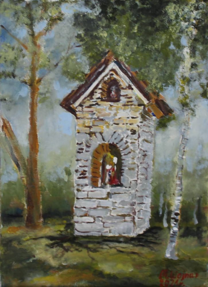 Harmonijna kompozycja cechuje również obrazy z elementem małej architektury - widoki kapliczek. Spośród prezentowanych prac Małgorzaty Wojnar wyróżnia je odmienne traktowanie szczegółów, co jest raczej oczywiste w przypadku obiektów architektury: o ich wyglądzie decydują linie proste, detale konstrukcyjne i wyodrębnienie z otoczenia. Nie każdy malarz, kierujący się głównie wyobraźnią i rzadko malujący z natury, sprosta temu zadaniu. Małgorzata Wojnar przyznaje, że wiele jej obrazów, także przedstawiających kapliczki, powstało „z pamięci” i nie można traktować ich jako fotograficznie wierne odwzorowanie rzeczywistości. Jest to całkowicie zrozumiałe w przypadku dzieła malarskiego, szczególnie ukazującego obiekt o charakterze sakralnym. Dlatego na podstawie prezentowanych obrazów kapliczek potrafimy określić typ budowli, szczegóły konstrukcji, rodzaj pokrycia czy fakturę muru. Widzimy kapliczki w ich otoczeniu, związane z nim grą światła i kolorów. Nie ma tu jednak zbędnych dekoracji, przyciągających wzrok, ale i odciągających uwagę od sedna wymowy obrazu kapliczki jako zmaterializowanej formy wiary, dziękczynienia, modlitwy, intencji.