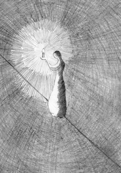 Niektóre z tych rysunków mają niemal mistyczny wymiar. Przykładowo: nad ciałem (może to stan śmieci klinicznej?) pojawiły się postaci jakby odziane w poświatę. Domyślamy się zaledwie, że to opiekuńcze duchy, może anioły… Tu autorka dopuszcza wielość interpretacji, o to chyba chodzi – wszak owa różnorodność odczuć jest w obszarze sztuki właściwa, wprost wskazana.