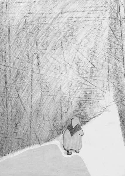 Wszystko to na poły baśniowe, magiczne, niekiedy połączone z motywami związanymi z białą magią cyrku. Staruszka, ze znamionami „ruskiej babuszki”, pojawia się jak wspomnienie, ona jest rodem z bajki, lecz to równocześnie synonim ludzkiego losu. Babuszka ta w tobołku życia dźwiga swój los, swój bagaż przeżyć. Z tobołka zamiast chwastów dla trzody wystają wieże cerkwi i kościoła, szczyt kapliczki z „rzymskim” krzyżem, obok kruszeje stara chatka a z krawędzi tego tobołka zwisają powiewając na wietrze powoje pluszaków, wagoników, aniołków. Akwarela z uroczą chatką, z której Pegaz wyskakuje w daleki świat, nakryty granatem nieba z mrugającymi na złoto gwiazdkami, to jakby ułamek doświadczeń staruszki, choć to niby już inna bajka.