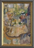 Czyste barwy, niekiedy w nadmiarze ich różnorodności, dają jeszcze inny efekt – przy oczywiście podjęciu określonego tematu. Otóż chodzi mi o ten rodzaj wyobraźni, który lokuje się głównie na granicy marzenia i snu. Adamkowska często wkracza w klimaty oniryczności, bywa, że wchodzi wprost w opowieść baśniową. Obraz, na którym możemy dostrzec (ale nie jest to konieczne!) dwa kocury przy barowym/ogrodowym stole, może popijają wzmocniony sok (nie mleko raczej), a może tylko grają w karty… Z jakiej „bajki” ta treść? Który z nich to Behemot? A koci kwartet tuszem – jakby jeden kocur pozował do… obrazu autorce?