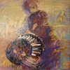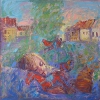 Dla jakby przykładu trzeba przyjść wzdłuż ścian przetykanych płótnami, jak po dobrym muzeum, i smakować osobno owe osobliwości. Miasto - jeśli pojawia się pejzaż miejski czy element architektury z urbanistycznej przestrzeni - staje się w swej prawie dosłowności nagle fragmentem miasta ze Sklepów cynamonowych Mistrza Schulza, wszak ono na pierwszym planie ma znak choroby - quasi łoże boleści podpowiada, że miasto to cierpi, że zawiera lub miało w sobie ból. Lecz daje się to miasto także odczytać inaczej. Uliczki mimo słonecznych przestrzeni smagnięte bywają chłodem błękitu, a częściej odcieniami nocnego fioletu, bo przecież znajdzie się tam sama samotność - kobiety? dziecka? zniedołężniałego staruszka? Wszystkich nas! A propos’ Schulza - wirująca postać ojca ze Sklepów... nasuwa kolejne skojarzenia - z Chagallem, bo spotkamy i postaci płynące wraz z obłokami...