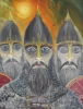 Na innym płótnie, pod niebem krwawym od łun dalekich pożarów, spomiędzy wzgórz niczym wiosenne wody, wartkie i spienione, rozlewa się złowrogi czambuł. Nie ma większego znaczenia, że nie pod buńczukiem idzie, a pod czerwonym proporcem z czarnym dwugłowym orłem, a i historyczny kostium nie ten. Wszak różni ciemięzcy tratowali te ziemie. Zbiorowa świadomość wchłonęła ich mieszając z rodzimymi krzywdzicielami; ofiary najazdów, przesiedleń, zapiekłej od pokoleń nienawiści - otuliły modlitwy, a bohaterów przygarnęły pieśni…